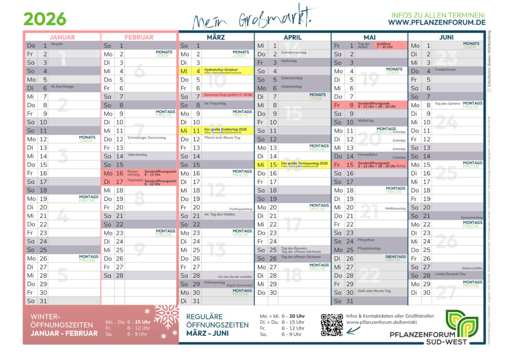 Ab 01.01.2026 gelten die verkürzten Winter-Öffnungszeiten im Pflanzenforum Süd-West. Diese gelten für die Monate Januar und Februar für alle Großhändler.