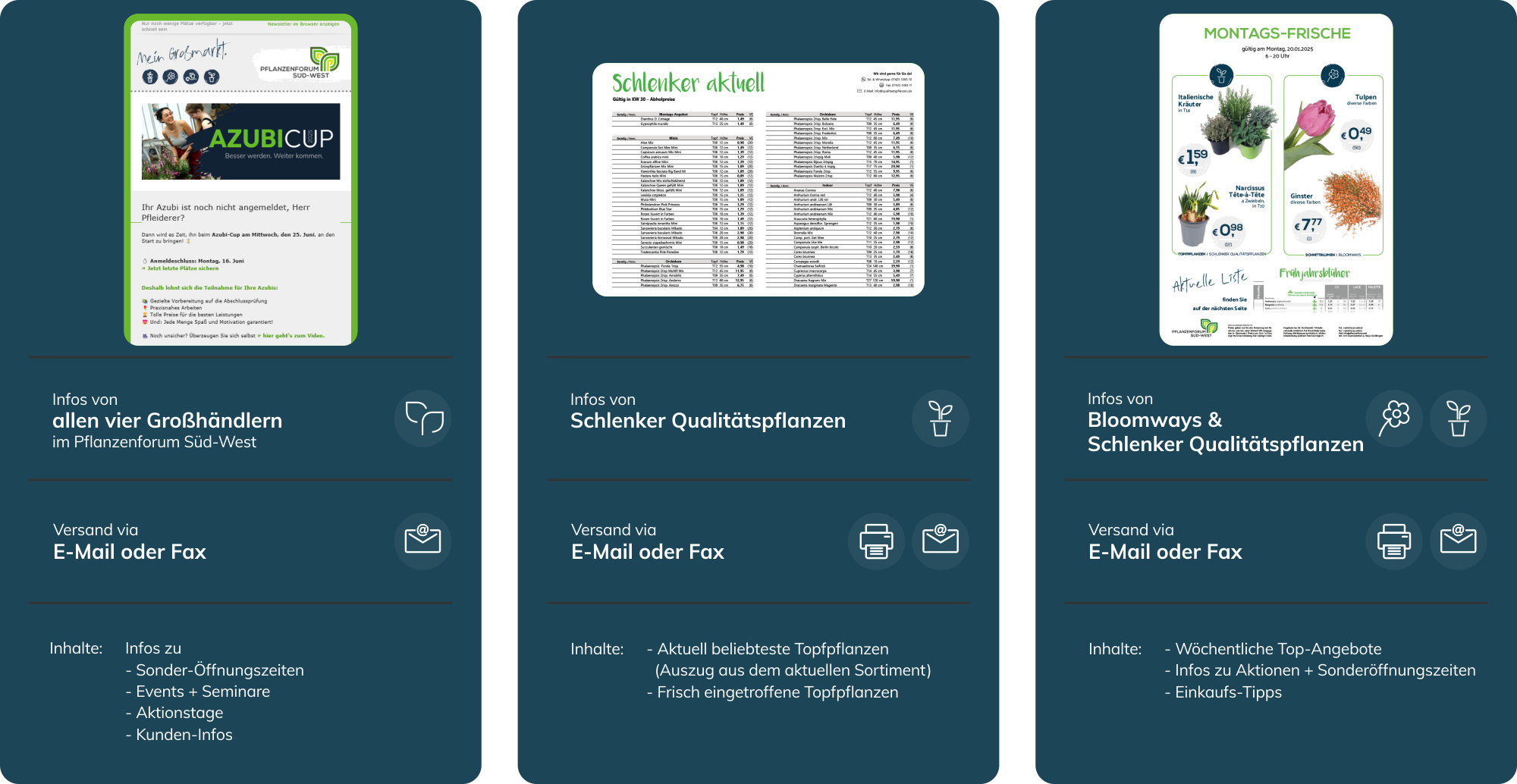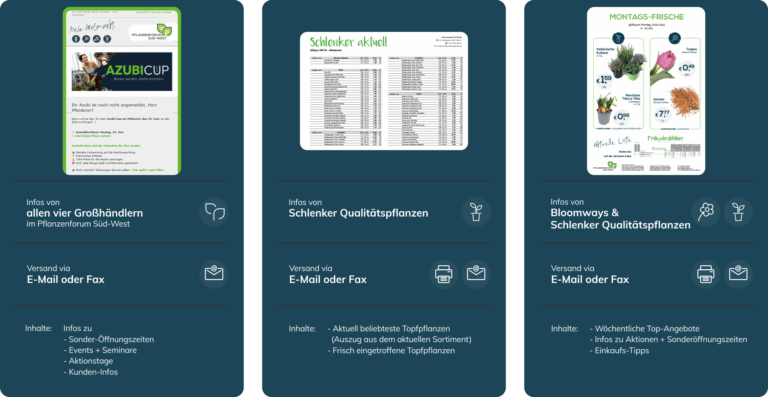 Die Änderungen werden dann von allen Großhändlern im Pflanzenforum Süd-West übernommen, so dass Sie nicht jeden einzeln kontaktieren müssen.